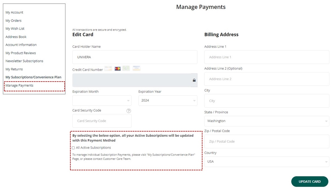 Customers can add or change the credit card for subscription/Convenience plan payment on the "Manage Payment'"page. However, If the customer has multiple plans and wishes to use different payment methods for each plan, please visit the 'My Subscriptions/Convenience Plan' page to manage. In this case, please follow the instructions provided above for "Update Payment Method"