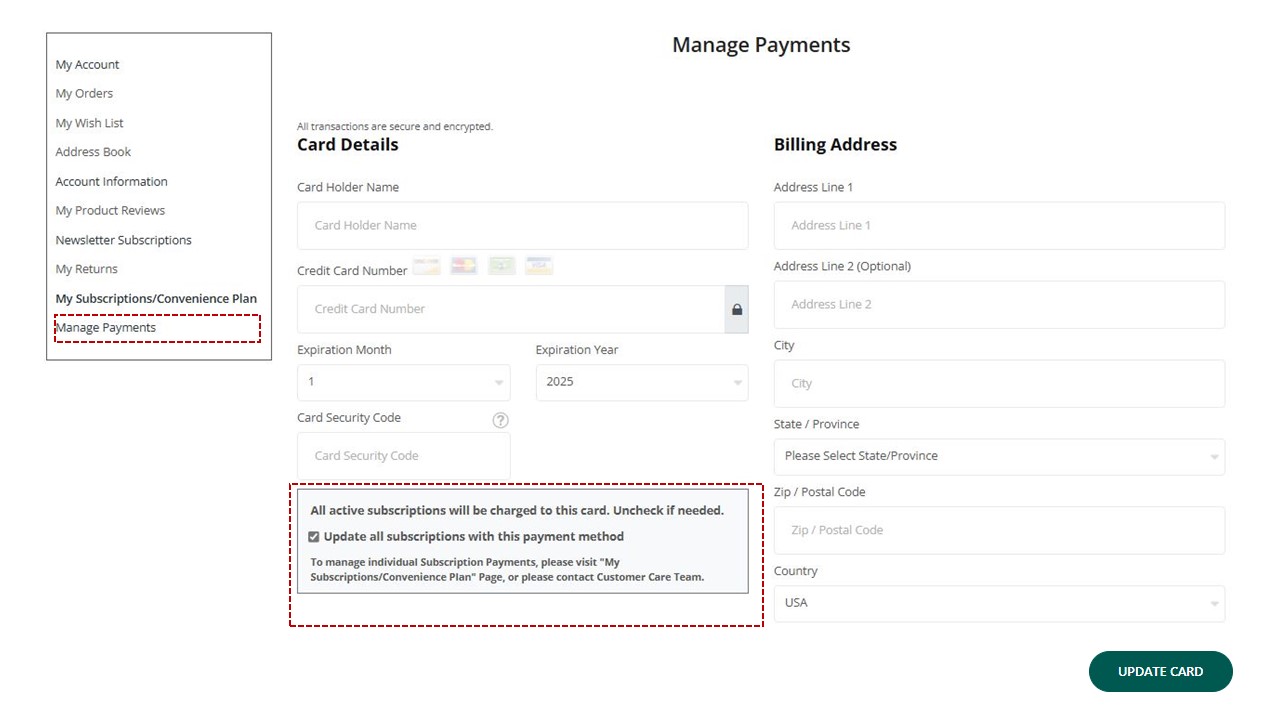 Customers can add or change the credit card for subscription/Convenience plan payment on the "Manage Payments" page. However, If the customer has multiple plans and wishes to use different payment methods for each plan, please visit the 'My Subscriptions/Convenience Plan' page to manage. In this case, please follow the instructions provided above for "Update Payment Method"
