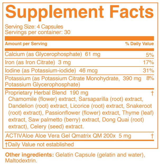 Chamomile (flower), Sarsaprilla (root), Dandelion (root), Horehound (herb), Licorice (root), Snakeroot (root), Passionflower (herb), Thyme (herb), Gentian (root), Saw palmetto (baya), Alfafa (leaf), Dong Quai (root), Celery (seed).