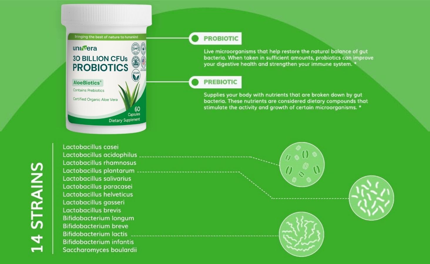 - Probiotics + Prebiotics: Univera’s probiotics and prebiotics are carefully crafted for optimal digestive health. Our prebiotics are naturally sourced from organic aloe vera, known to balance gut bacteria and support digestion. This complete supplement features 14 probiotic strains and non-GMO ingredients, free from binders, gluten, milk, eggs, wheat, peanuts, shellfish, and preservatives.