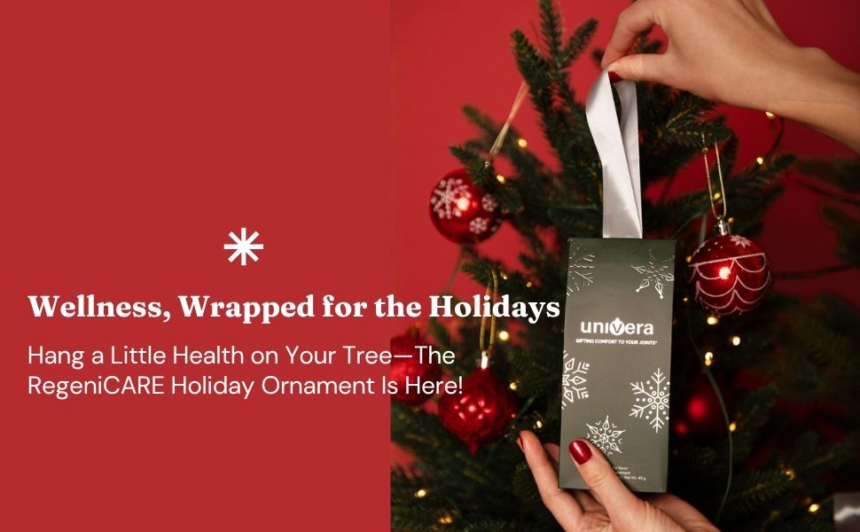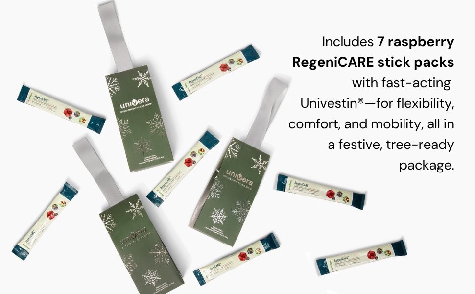 This season, give the gift of comfort and care with the limited-edition RegeniCARE Holiday Ornament—a festive, tree-ready package filled with 7 raspberry-flavored stick packs of our best-selling joint support formula.
