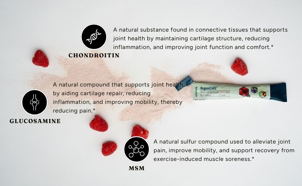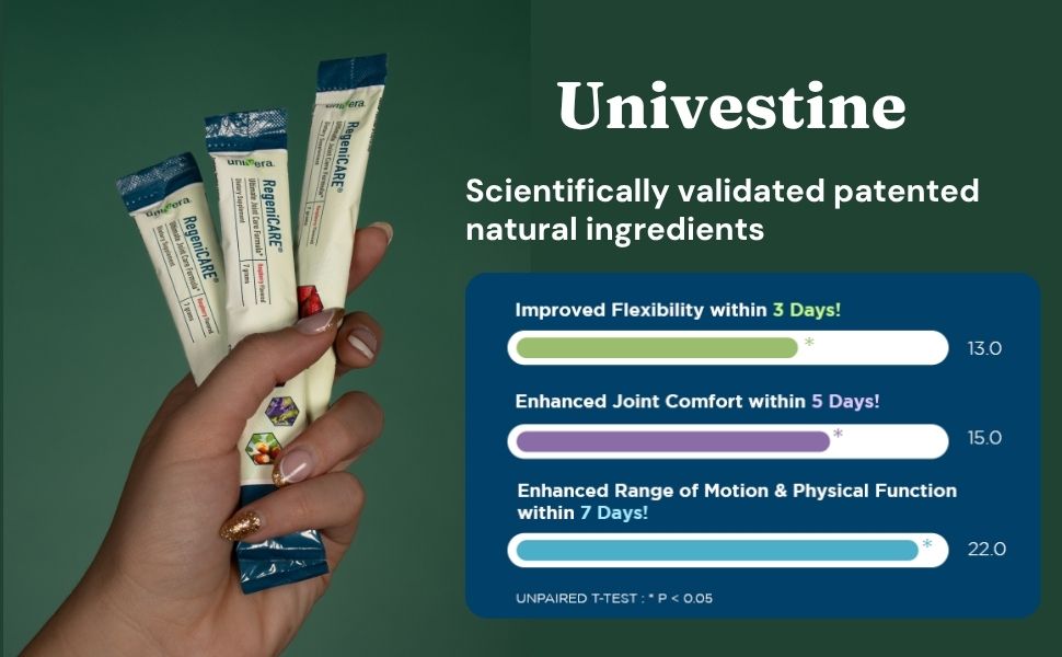Powered by Univestin®, RegeniCARE works fast to improve flexibility in just 3 days, ease joint discomfort in 5, and increase range of motion in 7. With Glucosamine, Chondroitin, and MSM, it also supports joint lubrication and cartilage renewal.